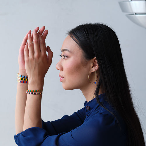 See our collection here +A different vibe every day? We love this for you. Time to add some colour coding to your outfit rotation with beads produced in Denmark and jewellery made of brass, silver and gold-plated brass with 18K red gold.